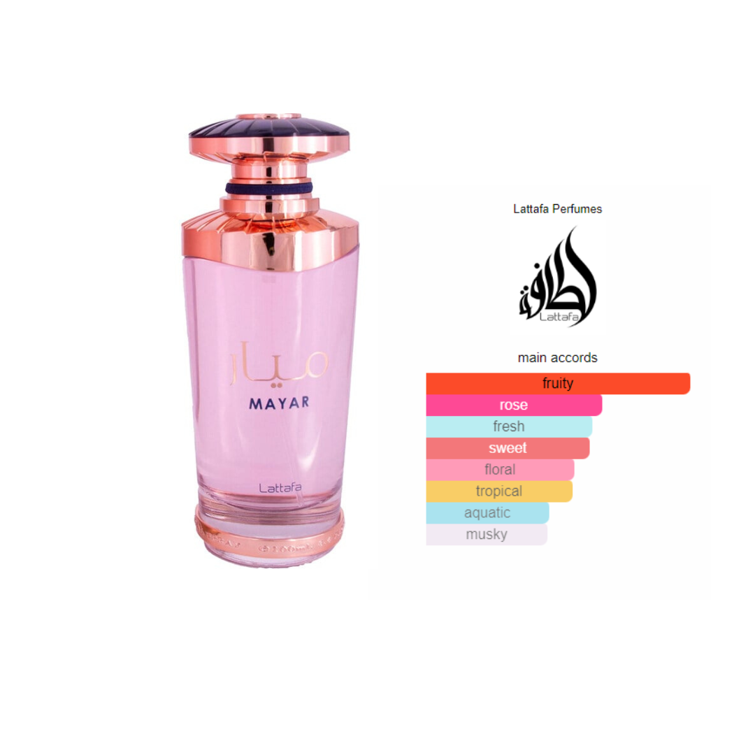 Embalagem: O frasco de Mayar é elegante e feminino, refletindo a sofisticação e a doçura da fragrância. Com um design atraente e moderno, é uma adição encantadora a qualquer coleção de perfumes e um presente ideal para amantes de fragrâncias florais e frutadas.